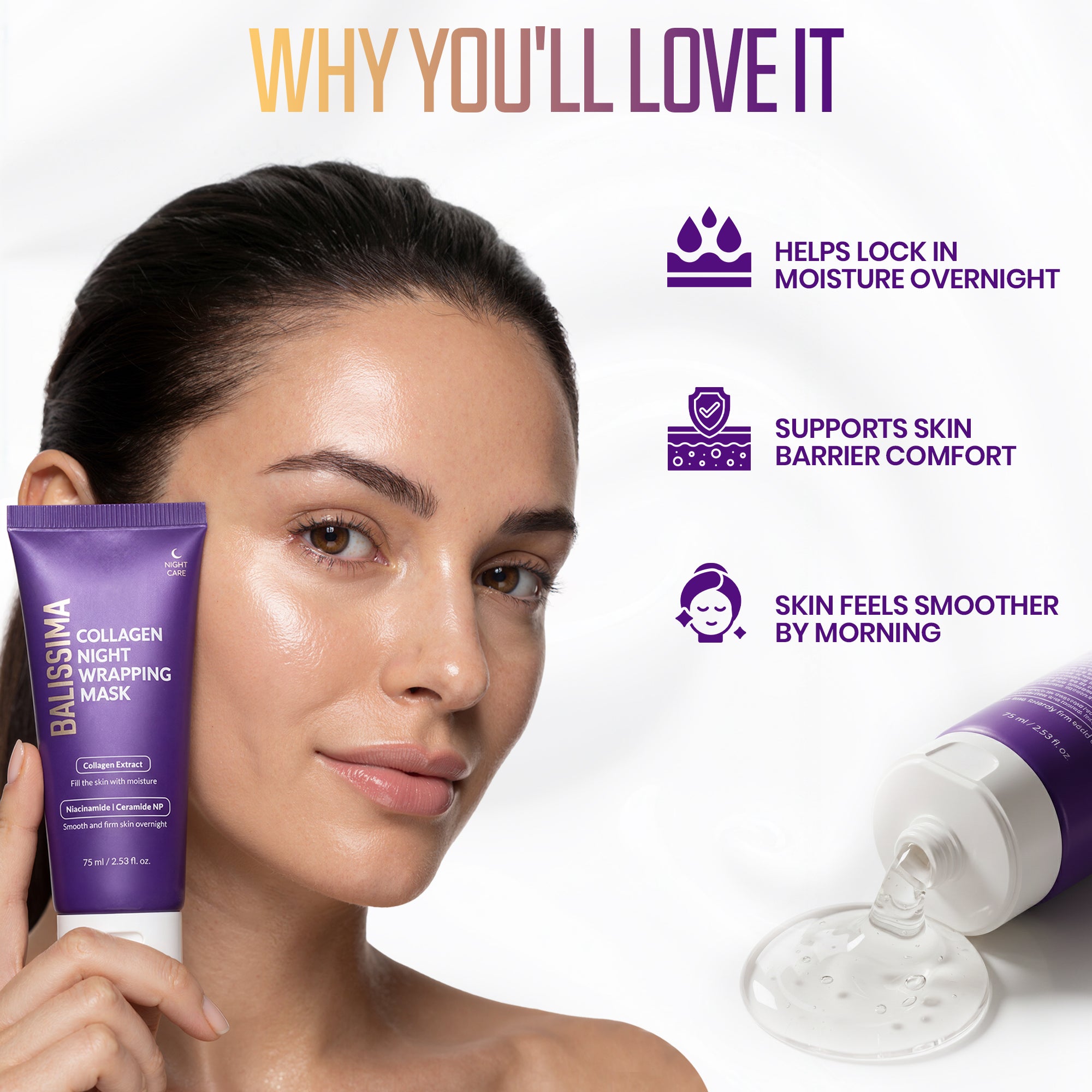 Overnight Skin Transformation "Visible Smoothness & Deep Hydration by Morning" Balissima Collagen Night Mask delivers intense overnight hydration to help skin look smoother, plumper, and refreshed after the first use.