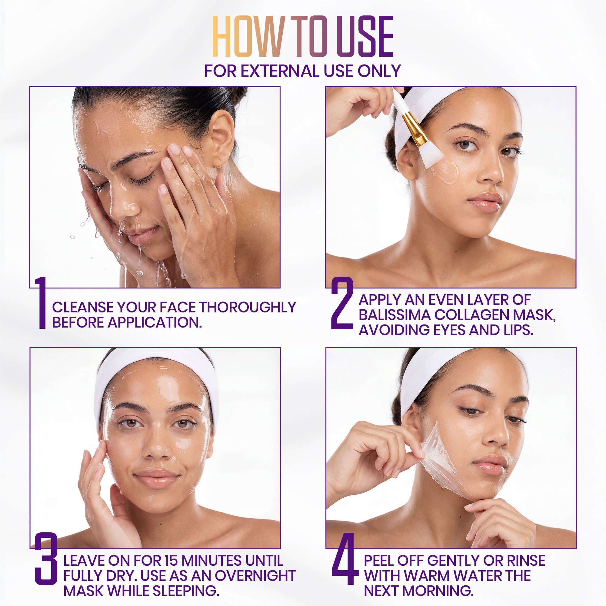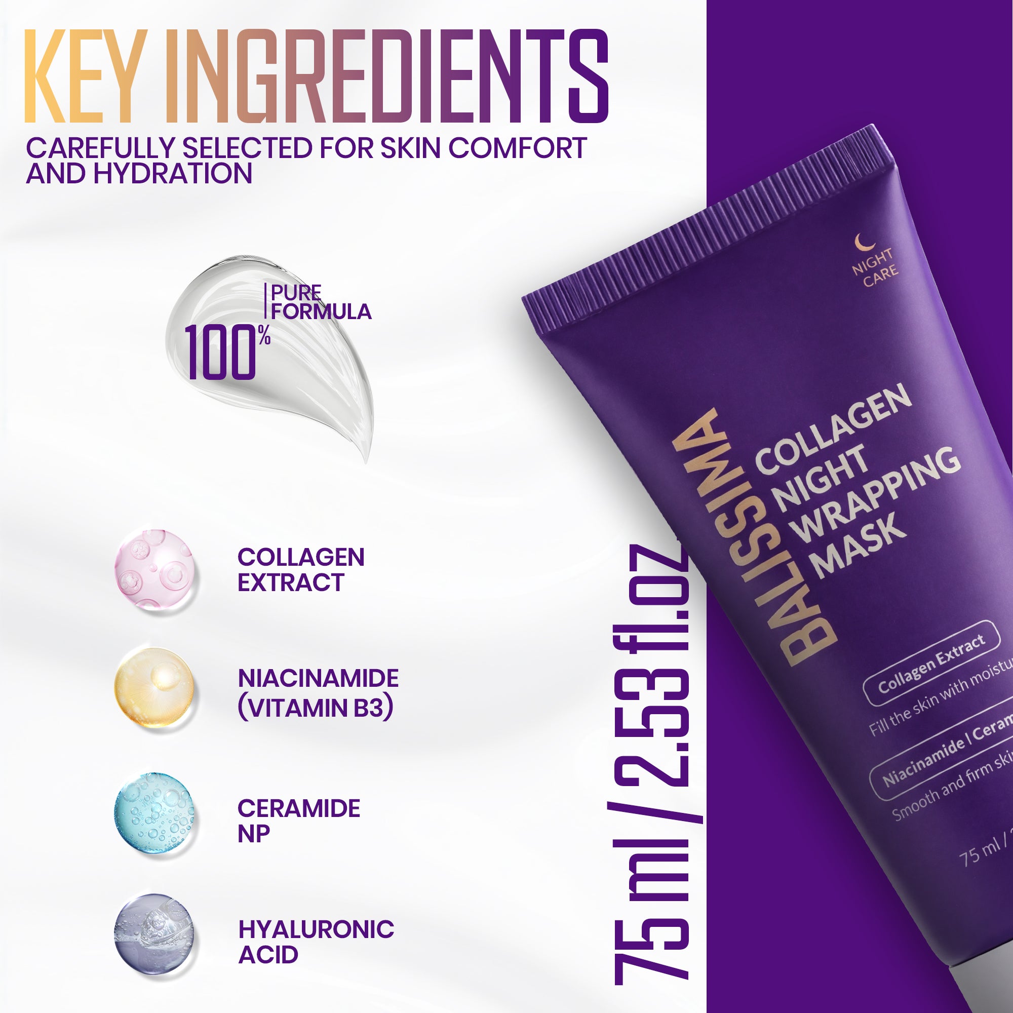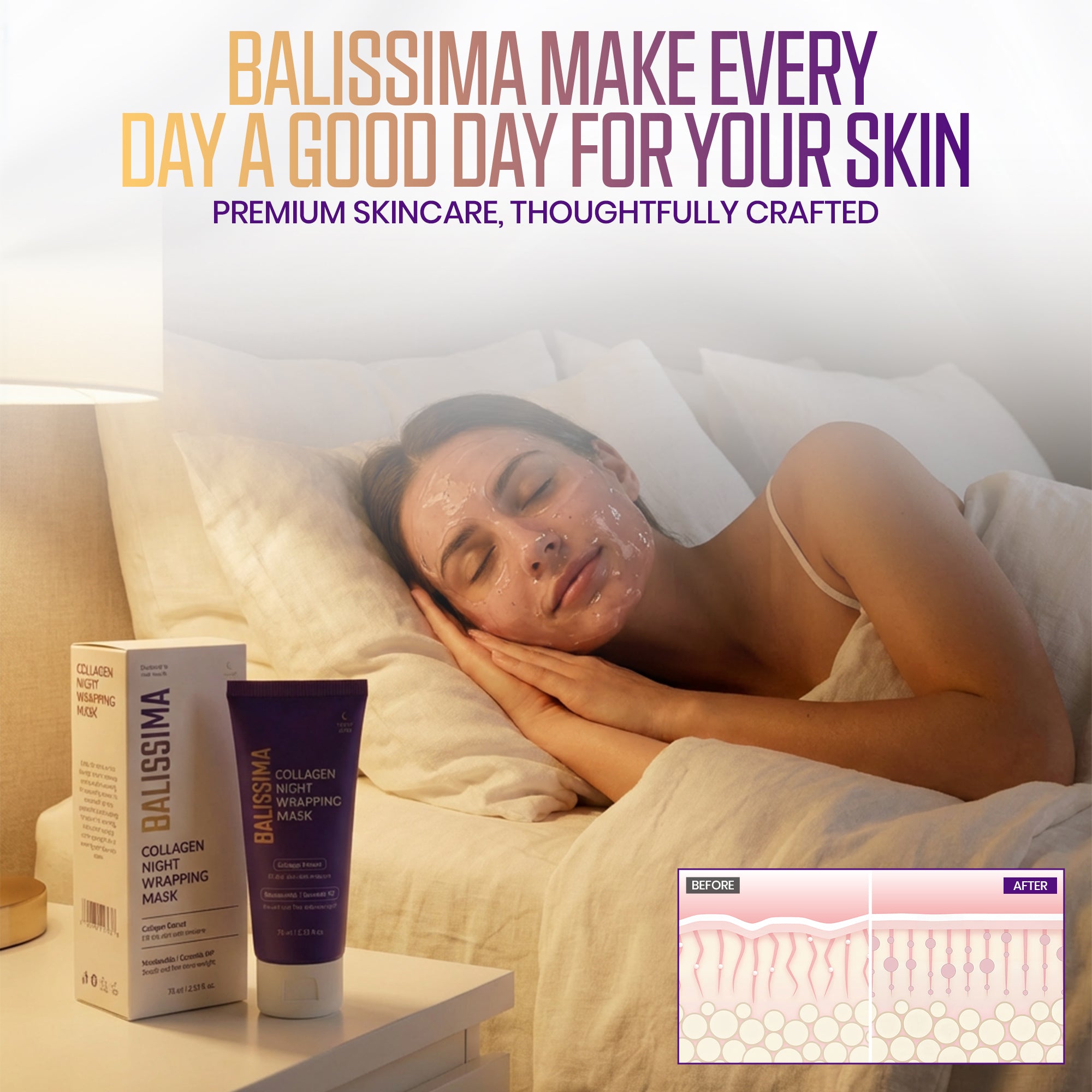 Overnight Skin Transformation "Visible Smoothness & Deep Hydration by Morning" Balissima Collagen Night Mask delivers intense overnight hydration to help skin look smoother, plumper, and refreshed after the first use.